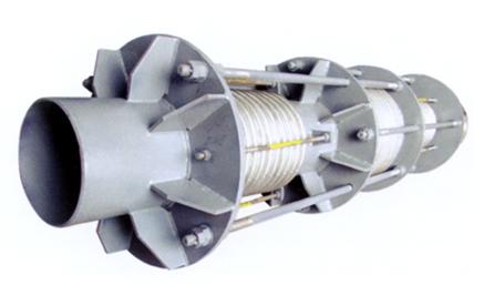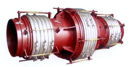 腰鼓式直管壓力平衡波紋膨脹節(jié)的兩端各有一個工作波紋管,中間有一個平衡波紋管,膨脹節(jié)通過受力構件(大拉桿或舌管)來承受內壓推力。因此管系中間固定支架。此類膨脹節(jié)只能吸收軸向位移。